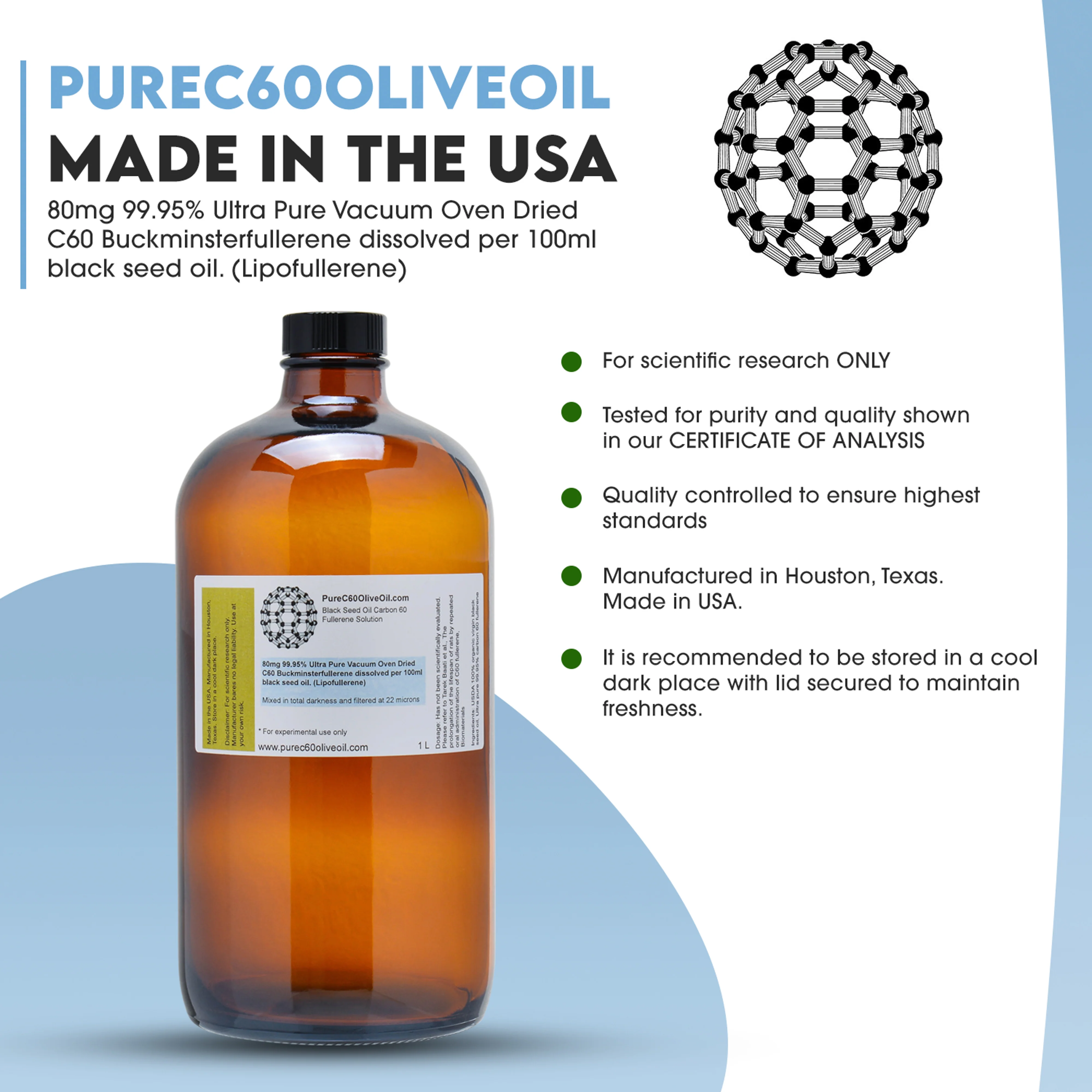 Research grade 800mg of ultra pure (99.95%) carbon 60 in 1L USDA organic virgin black seed oil