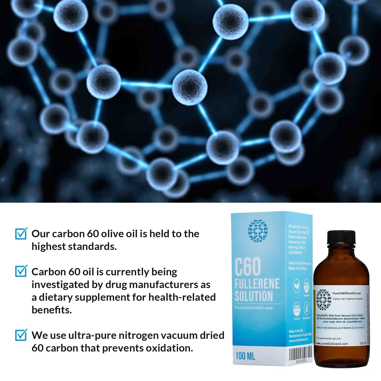 Research grade 80mg of ultra pure (99.95%) carbon 60 in 100ml USDA organic extra virgin olive oil